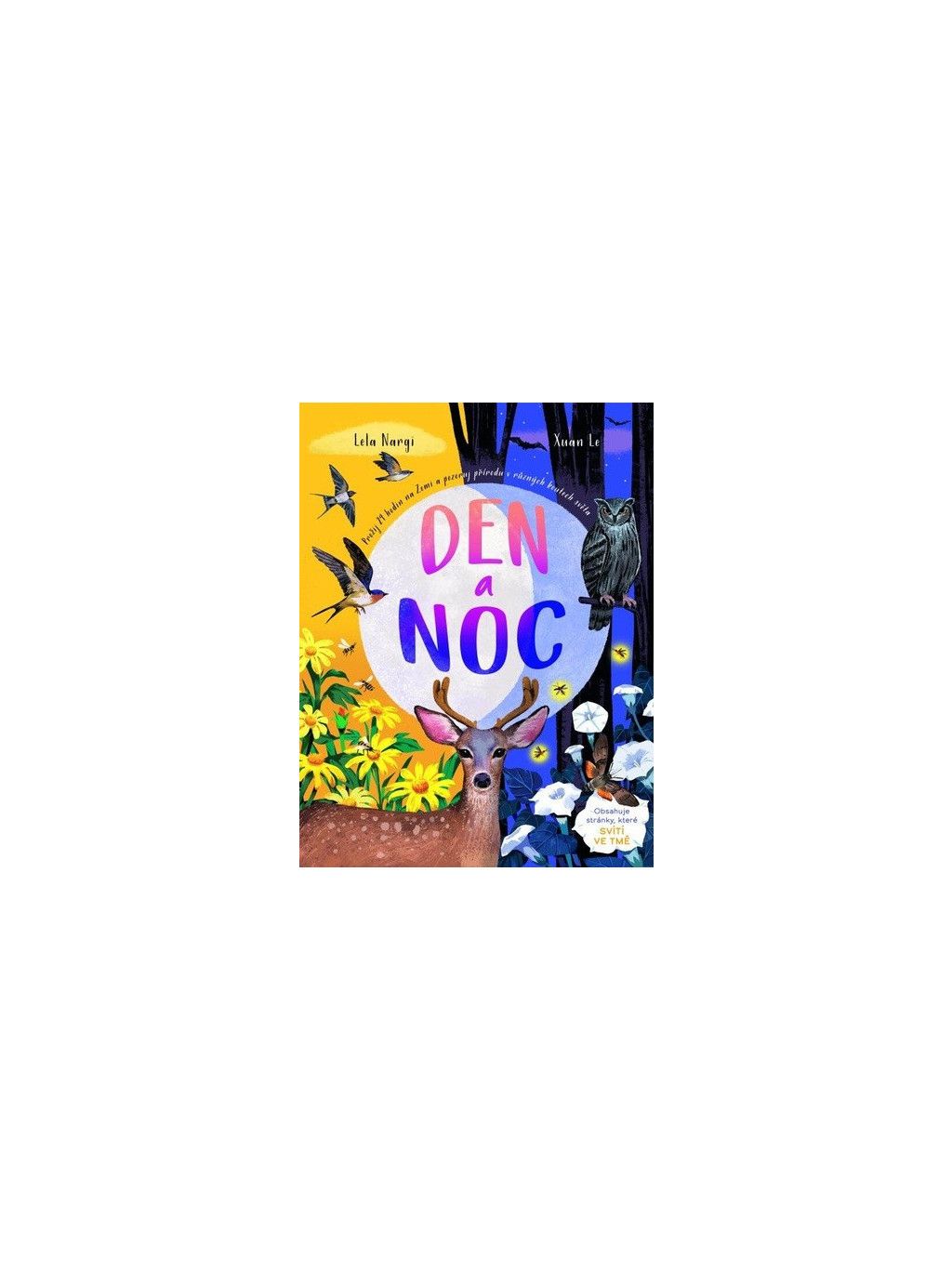 V knize Den a noc děti prožijí 24 hodin na naší planetě a budou sledovat přírodu v jednotlivých částech dne na různých místech na Zemi. Za úsvitu mohou sledovat jelence ušaté na západě Severní Ameriky, v poledne se podívají do malajské džungle, v podvečer do Evropy za vlaštovkami lovícími nad vodní hladinou a večer mohou obdivovat například dlouhozobky sající nektar z měsícem rozzářených povíjnic. Čtivé texty nabité nejrůznějšími zajímavostmi doprovázejí krásné velkoplošné ilustrace a označené stránky se navíc po nasvícení ve tmě rozzáří.Doplňkové parametry