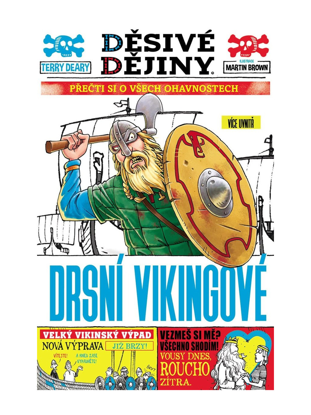 Jak moc byli Vikingové drsní? Jak se to vezme – tak trochu záleží na úhlu pohledu. Ve středověku první setkání s nimi obvykle za moc nestálo: připluli na dlouhých lodích, vyskákali na břeh, pozabíjeli mečem nebo sekerou každého, kdo se jim postavil na odpor, a pak vyplenili okolí. Jako praví nájezdníci. Jakmile se na ně ale podíváš zblízka, zjistíš, že vlastně žili jako všichni ostatní: obdělávali pole, obchodovali, bavili se, starali se o své rodiny. Něco zvláštního na nich ale stejně bylo. Milovali hrdinské příběhy, sepisovali sáhodlouhé básně, vydávali se na nebezpečné daleké výpravy po moři, dávali svým dětem podivná jména, rádi obsazovali vzdálená území a zanechali po sobě stopy i na místech, kde by to nikdo nečekal. Prostě prvotřídní materiál pro Děsivé dějiny! Čekají na tebe králové Harald Krásnovlas a Sven Vidlí vous, obr Gilling, nájezdník Hastein, nešika Eyjolf a spousta dalších zajímavých Vikingů i jiných postav. A jako obvykle nechybí zábavné kvízy, hromada překvapivých informací a neočekávaných souvislostí. Po přečtení zjistíš, že jsi možná také tak trochu Viking!Doplňkové parametry