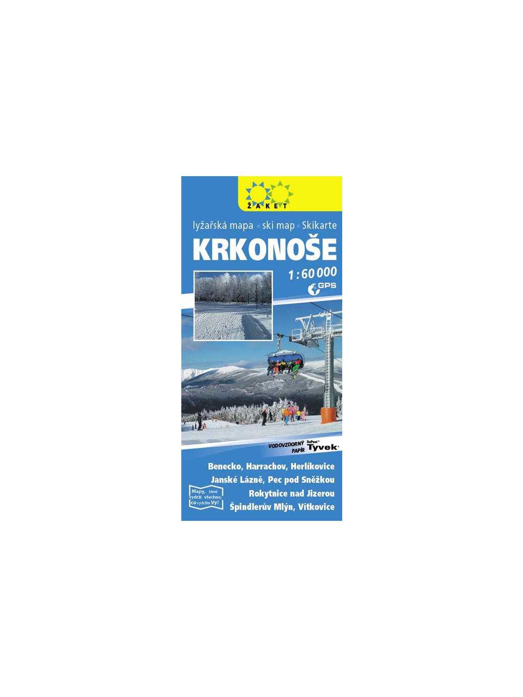 4. aktualizované vydání lyžařské mapy Krkonoš na vodovzdorném neroztrhnutelném syntetickém materiálu Tyvek. V mapové části jsou zvýrazněny lyžařské areály se všemi sjezdovkami, doplněné údaji o možnostech nočního lyžování, umělého zasněžování či možnosti úschovy lyží. Samozřejmostí je zakreslení značených lyžařských běžeckých tras. Na zadní textové straně naleznete detailní informace o jednotlivých střediscích, seznam sjezdovek s uvedením jejich délky a další informace.Doplňkové parametry