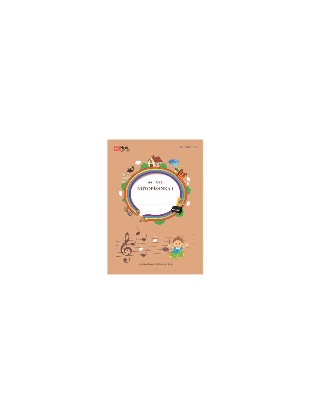 A4 - XXL Notopísanka 1 - Délka not a pomlk, houslový klíč. čb pracovní sešit A4-hudební publikace pro ZŠ a ZUŠ Děti se v ní naučí psát houslový klíč, notu celou, půlovou, čtvrťovou a osminovou. Také všechny pomlky a tempové označení taktu. Notopísanka obsahuje také úkoly a rébusy pro děti, na kterých si hravou formou procvičí vše, co se naučily. Notopísanka je určená pro I. stupeň ZŠ a PHV na ZUŠ.Doplňkové parametry