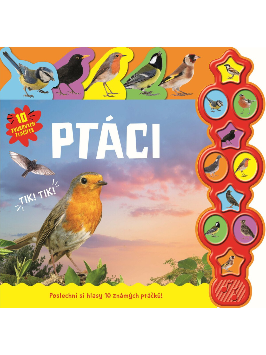 V této knížce, která na první pohled upoutá zajímavým designem s tvarovanými záložkami, se děti seznámí s deseti našimi nejběžnějšími ptáky, jako jsou sýkora koňadra či modřinka, vrabec domácí, červenka obecná nebo kos černý. Dozvědí se o nich základní informace i různé zajímavosti a po zmáčknutí příslušného tlačítka si poslechnou, jaké zvuky daný pták vydává.Doplňkové parametry