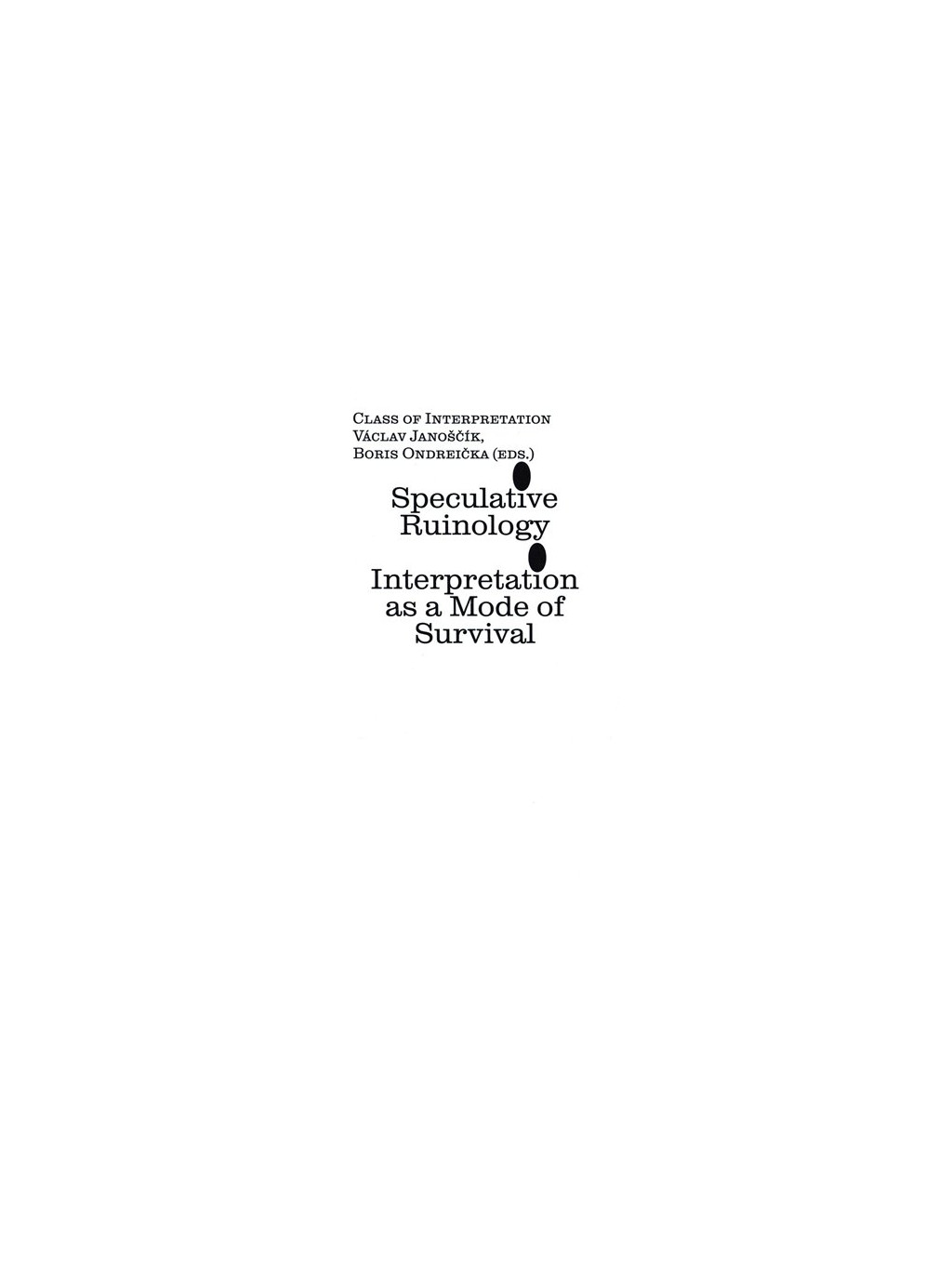 Pod neustávajícím útokem střepů obrazů, problémů vzdálených i blízkých, konfliktních perspektiv a možností, kterou jsou podmíněné a zaujaté, pod tlakem toho všeho se mění náš vztah k interpretaci. Nejde jen o nějaký nástroj nebo odbornou metodu, je to aktivita, skrze kterou žijeme a definujeme své identity. Tato nevyhnutelnost a důležitost interpretace nás nutí k nové politické vizi a identifikaci. My, umělci, aktivisté, para-akademici, živící se psaním nebo výzkumnými projekty a kulturními aktivitami tvoříme "třídu interpretace”. Kniha Spekulativní ruinologie: Interpretace jako způsob přežití je prvním knižním projektem Class of Interpretation založeném Borisem Ondreičkou a Václavem Janoščíkem, momentálně se zázemím na Akademii výtvarných umění v Praze. Bombarded by fragments of images, problems close or remote, conflicting perspectives and always-already biased options - interpretation became not just a tool or specific method, it is an activity through which we live and realize our identities. Such necessity and dominance of interpretation calls for different political vision or identification. We, artists, activists, para-academics, writers, researchers and cultural agents thus form an interpretive class. The book Speculative Ruinology: Interpretation as a mode of Survival presents a first book project of Class of Interpretation, founded by Boris Ondreička and Václav Janoščík and based on the Academy of Fine Arts, Prague.Doplňkové parametry